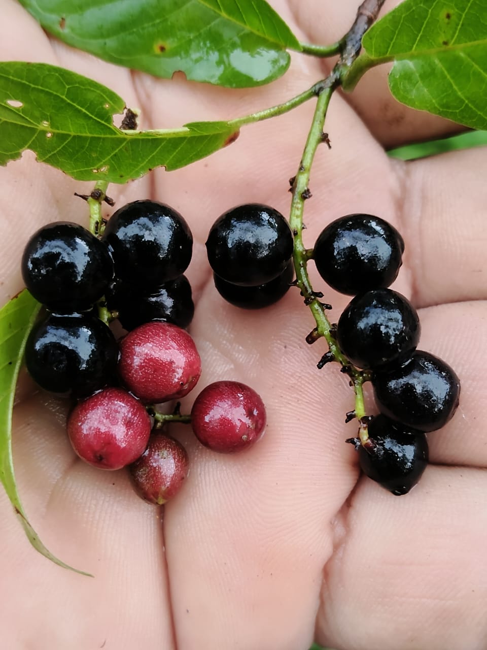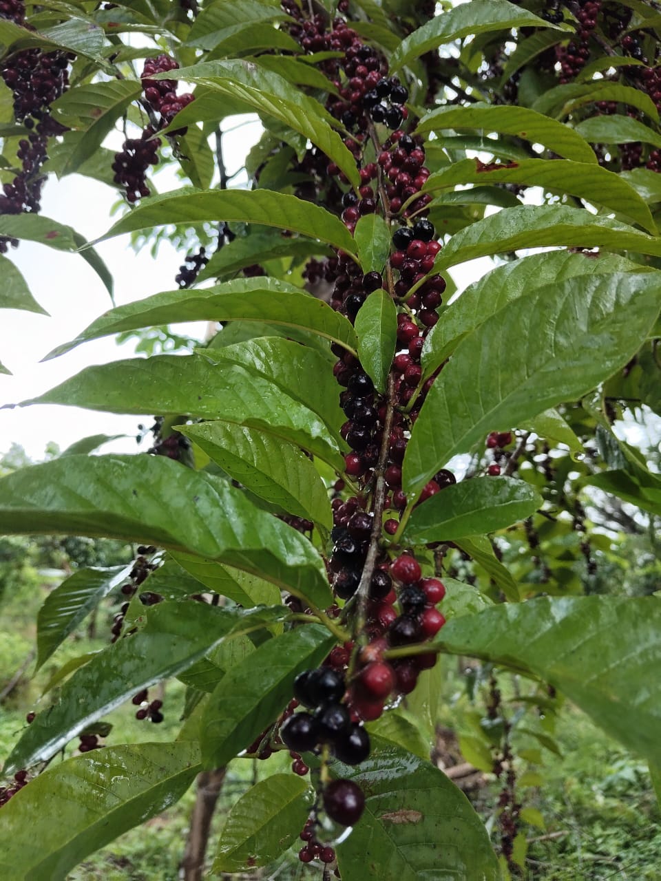 This rare Coccoloba species from Colombia is a striking wild relative of the better-known Coccoloba uvifera (sea grape), bearing abundant dangling clusters of glossy berries that ripen from vibrant red to deep black. The plant forms a shrubby or small tree habit, thriving in tropical conditions and producing fruit directly along its arching branches. Its visually appealing racemes resemble strings of black pearls, making it a beautiful and productive candidate for food forests or native fruit collections. While the flavor profile is still being evaluated, the fruit's visual appeal, clustering habit, and likely tart-sweet taste suggest strong potential for local use and botanical curiosity