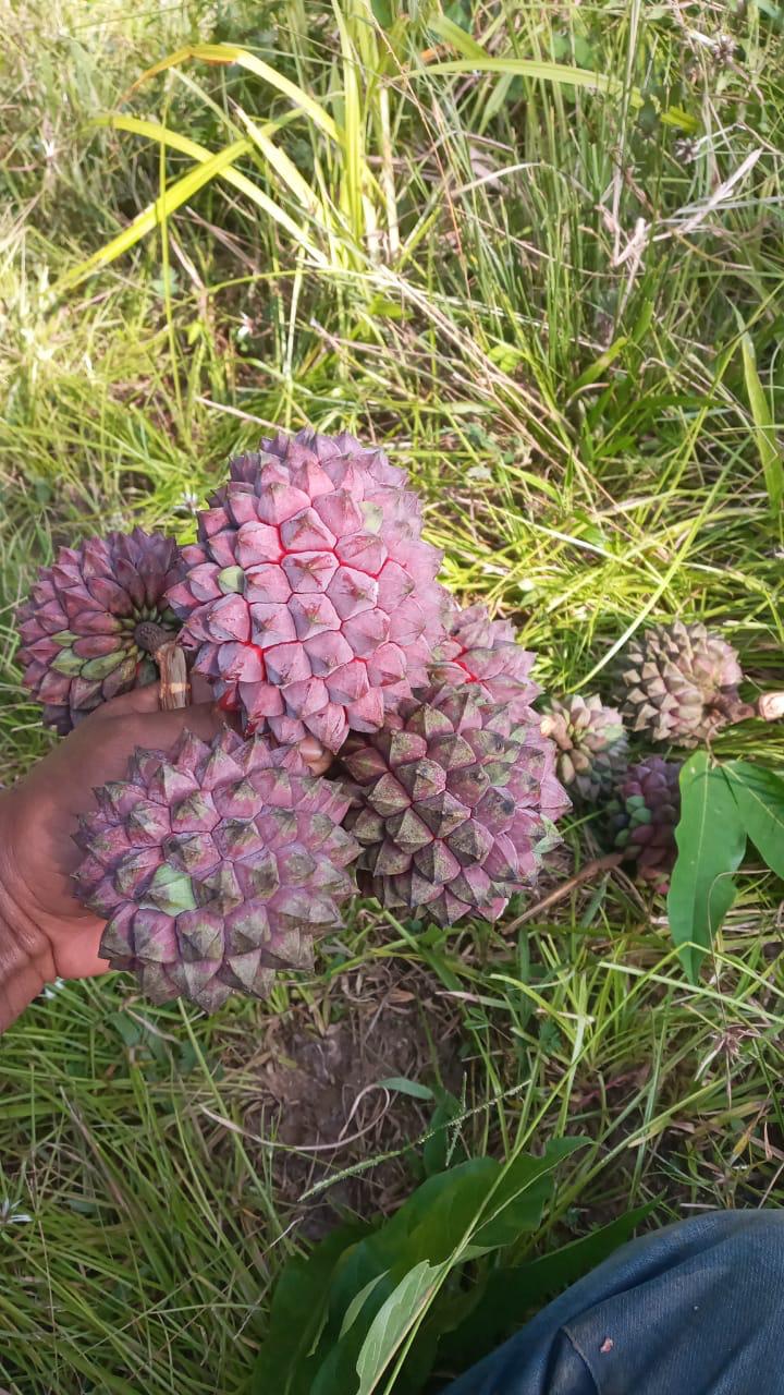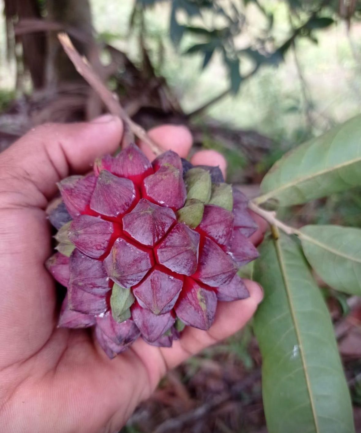 Duguetia cf. vallicola is a striking and rare species collected from the subregion of Urabá in Antioquia, Colombia. This tree reaches an adult height of 7–8 meters and begins fruiting at around 5 years of age. Its unique fruits, as shown in the image, have a spiked, layered texture and an appealing reddish-purple hue. Inside, the pulp delivers a honey-sweet flavor, making it a true treat for fruit enthusiasts. Thriving in its tropical environment, this species showcases its ecological and ornamental appeal, adding to the diversity of Colombia's rich flora.