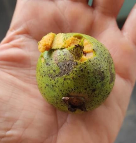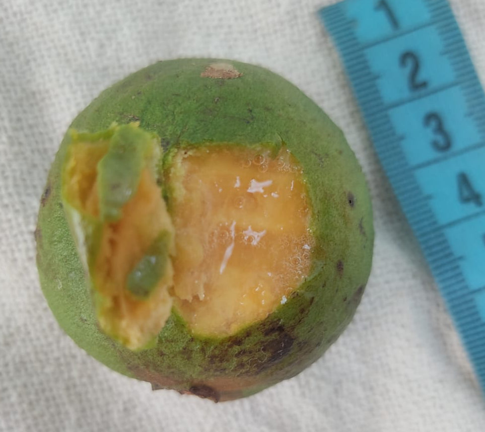 What truly sets Batingão apart is its phenomenal fruit production. The tree yields abundant, large fruits—among the largest in the genus—with a smooth, shiny green skin when fully ripe and a size just under a golf ball. The bright yellow pulp is firm, slightly juicy, and intensely sweet, offering a 70/30 pulp-to-seed ratio, which is exceptional for Eugenia. Though the skin is tingly, drying sensationastringent and not recommended for fresh eating, the flesh is rich and flavorful, making it a standout for culinary use.