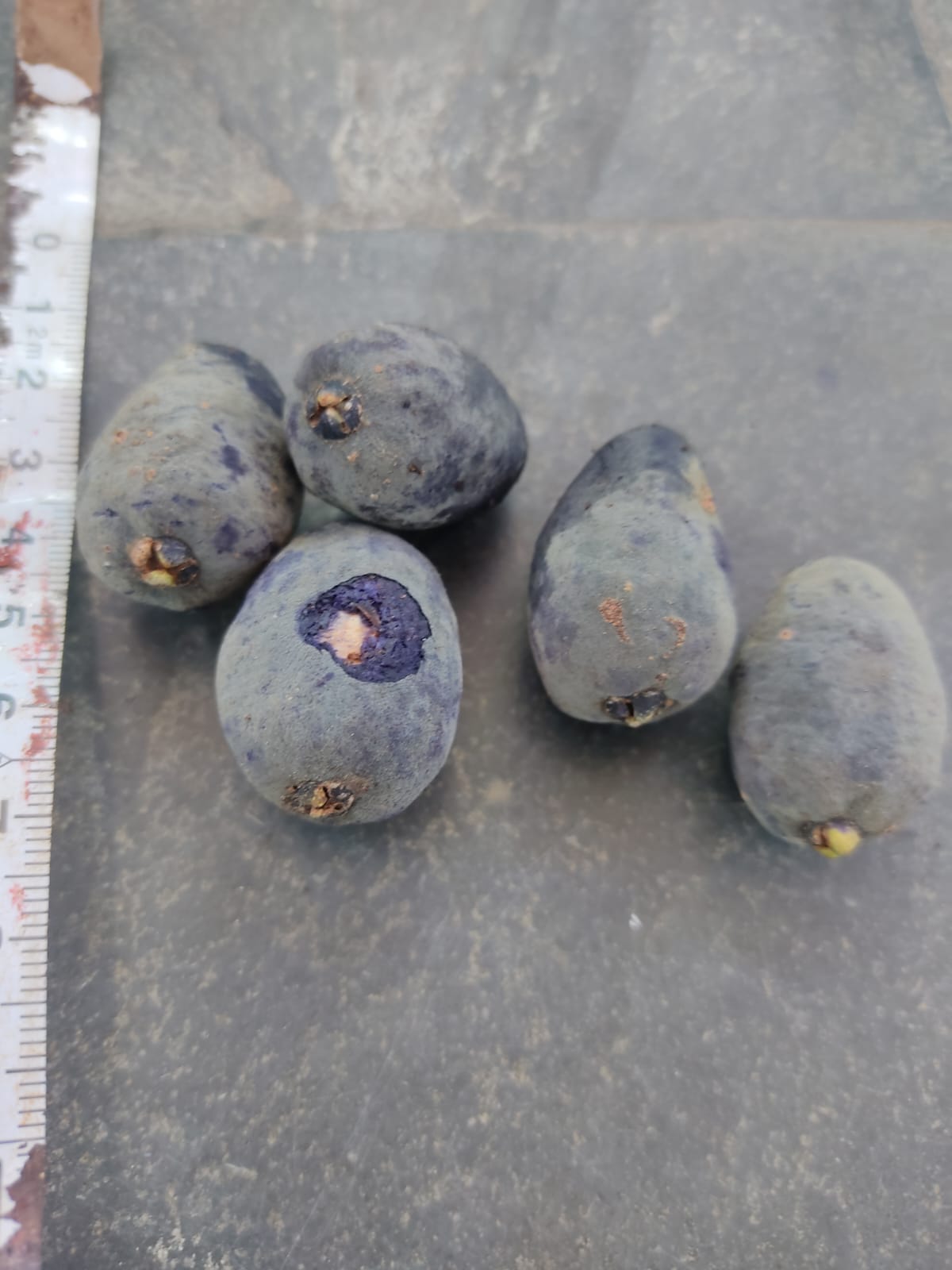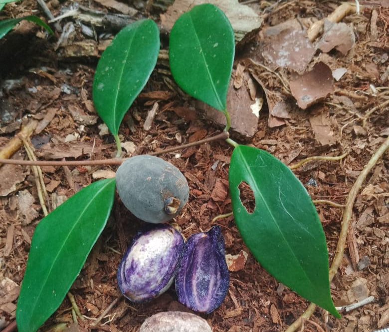 Eugenia sp. “Ypiuna” is from Una, Bahia. An aromatic and visually striking member of the Myrtaceae family. This small tree, reaching approximately 8 meters in height, bears rounded fruits with a dark outer skin and a uniquely purple-marbled interior. The pulp is sweet, while the skin carries a light astringency. Both seeds and fruits are notably fragrant, enhancing their appeal. Its ornamental foliage and highly attractive fruit coloration make it an exciting find for collectors and admirers of rare tropical fruits from Brazil’s Atlantic Forest.