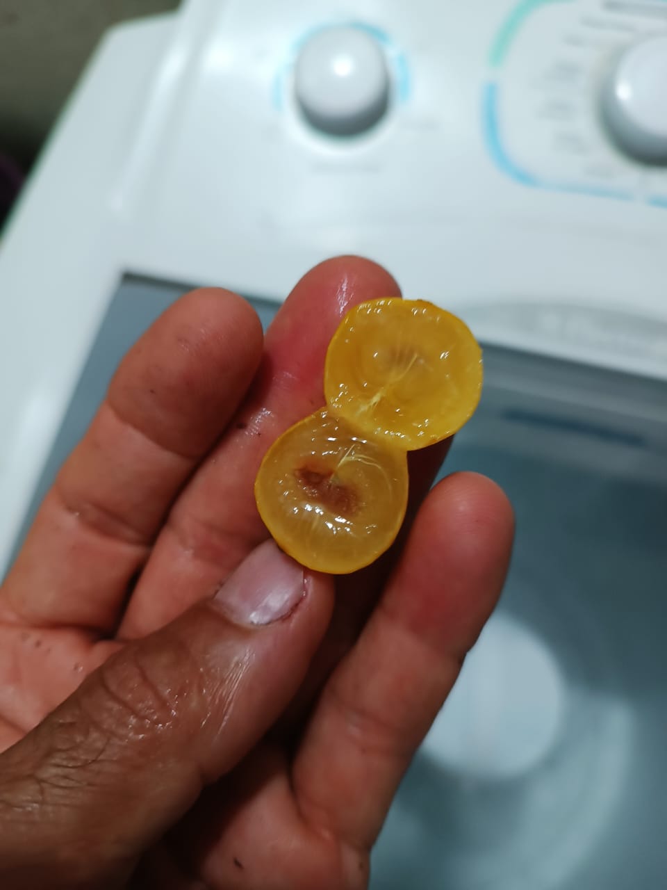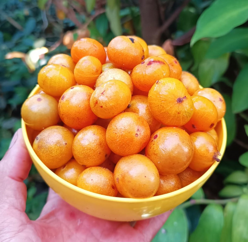 It's a very large (3 cm+) fruited type of yellow Myrciaria, from same area as Myrciaria sp. Pastora (which is red), tasting very sweet and delicious! It belongs to the same group as guaquiea-strigipes-glazioviana, but definitely none of them! Its leaves are quite distinctive from them, as well as the fruits are much bigger and with smaller seeds. Definitely NOT a selection, but a true species, as it grows wild in same area (restingas at Rio Paraíba do Sul moth).