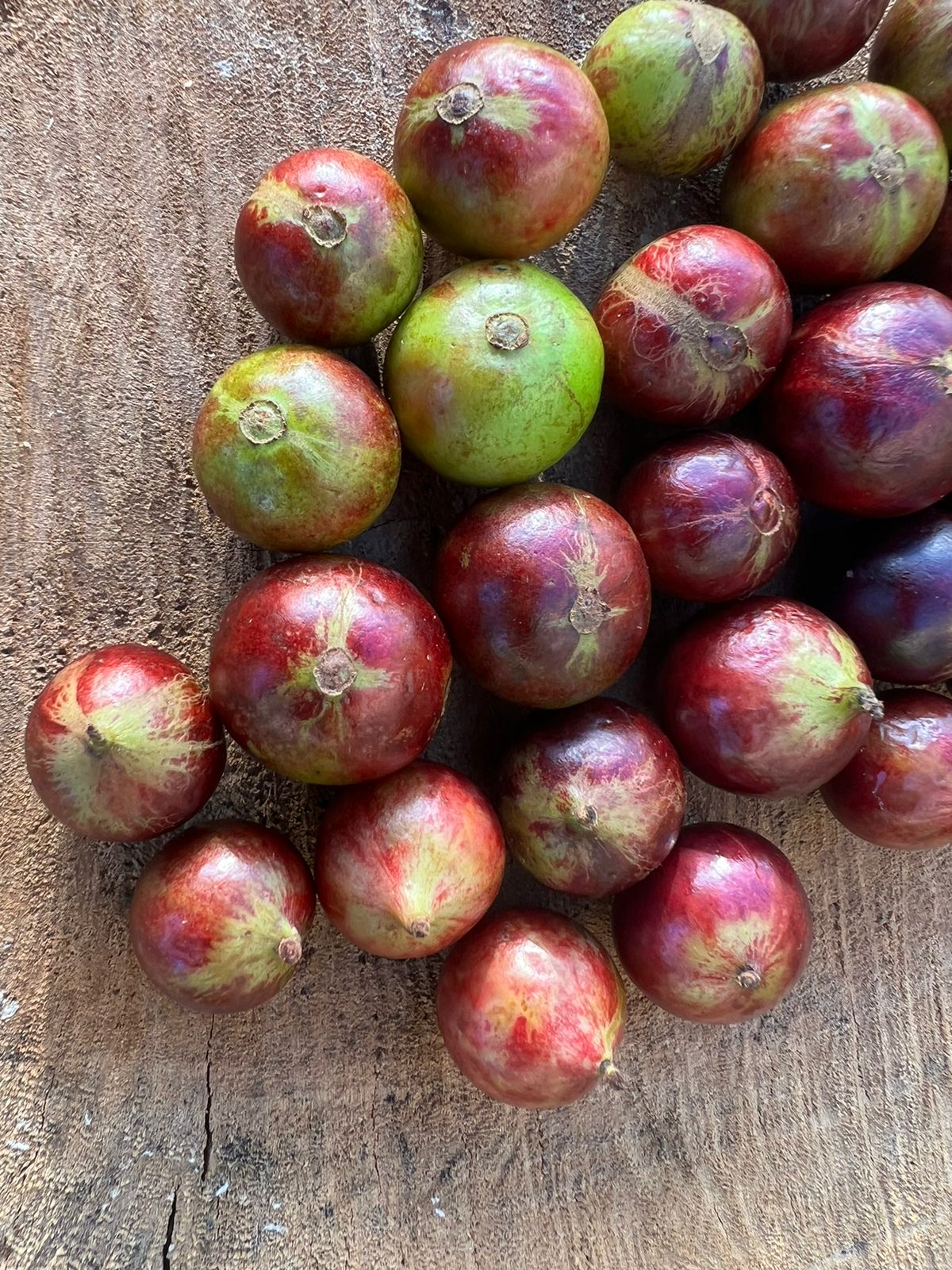 Plinia sp. "Jabuticaba Nova Coronata Rajada" is a spectacular and visually arresting jaboticaba variety, newly identified for its striped or marbled (rajada) skin and prominent floral canopy of a treecrown (corona) at the fruit’s the highest point or vertex of a plant stemapex—a hallmark of the coronata group. This variety blends ornamental elegance with fruit quality, offering a striking combination of color variation, canopy of a treecrowned structure, and likely sweet, juicy pulp typical of the Plinia coronata lineage.