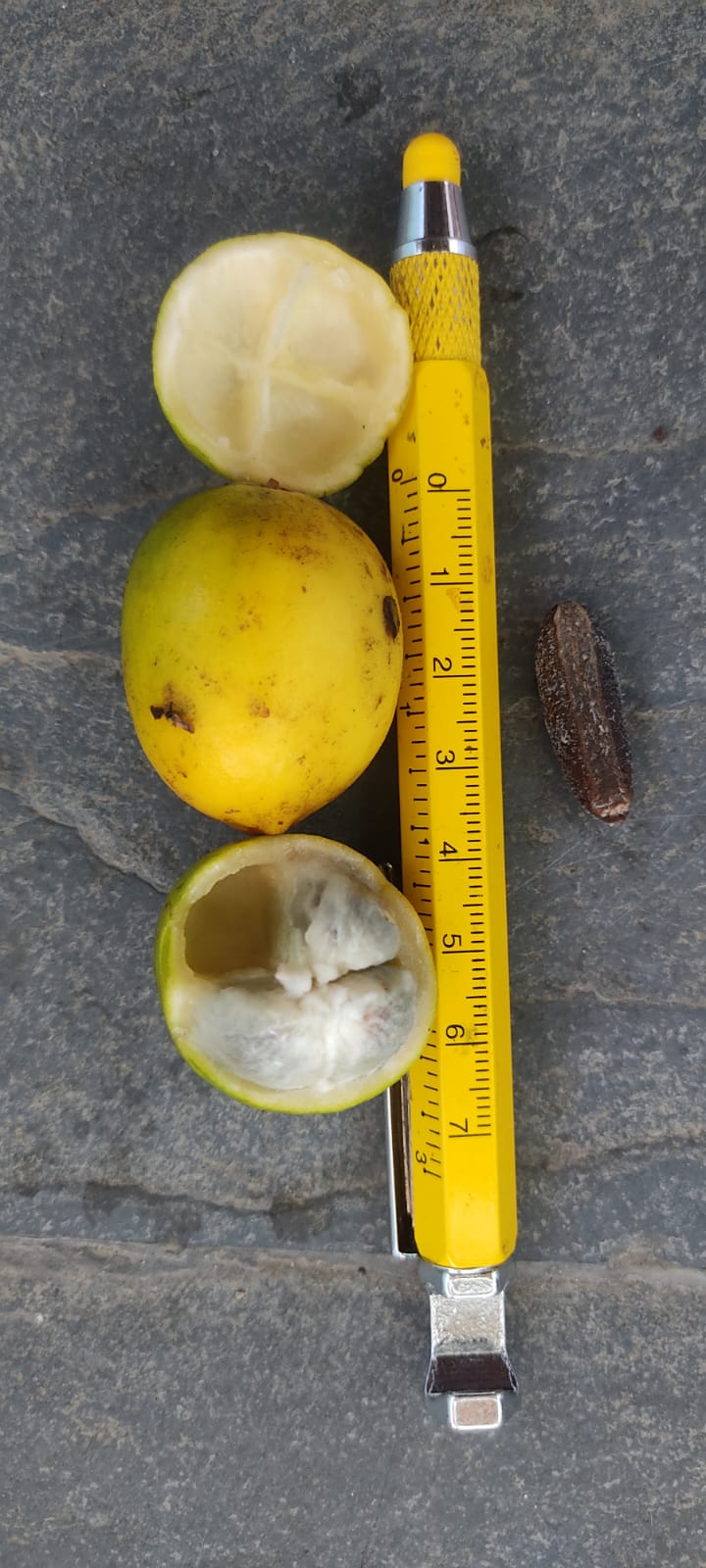 Pouteria sp. "Confusa" is a native tree reaching about 12 meters in height, found in Itacaré, Bahia, thriving in clay-rich soils of the Atlantic Forest. It produces fruits with a hard shell and a sweet pulp that surrounds the seed, offering a pleasant contrast in texture and flavor. Though still taxonomically undefined—hence the name "Confusa"—this species shows strong promise for edible use, and its adaptability to local conditions makes it a valuable candidate for conservation and rare fruit cultivation.